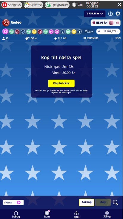 - Roligt chattrum – Precis som de flesta av våra bingorum kommer Rodeo Bingo med en schysst och trevlig chatt. Här kan du umgås med andra spelare medan du märker av din biljett. Delad glädje och spänning är dubbel glädje och spänning!
