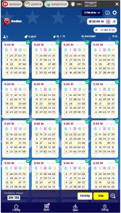 Rodeo Bingo är ett rum med 75-bollars bingo och älskas av många olika spelare. Reglerna är lite annorlunda från 90-bollars bingo – hur detta är förklarar vi lite längre ner. När du spelar i Rodeo-rummet kan du vänta dig följande: