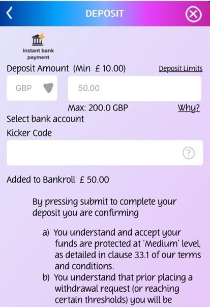 To make a deposit into your PlayOJO account using the Instant bank payment method, look for the “Instant bank payment” option in your Deposit section. You’ll then be asked for your deposit amount and any Kicker code.