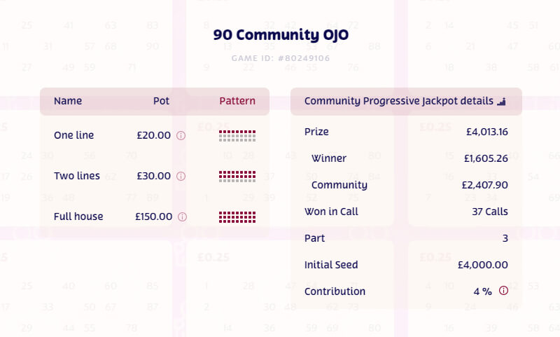 Jackpots are additional prizes added to bingo games that you can win if you complete a specific condition (for example a Full House or a pattern) before a certain number of balls have been called. Check the game info box for the specific rules of bingo for your game, or learn more about UK bingo jackpot rules and how to play jackpot bingo games in our guide to how jackpots work.