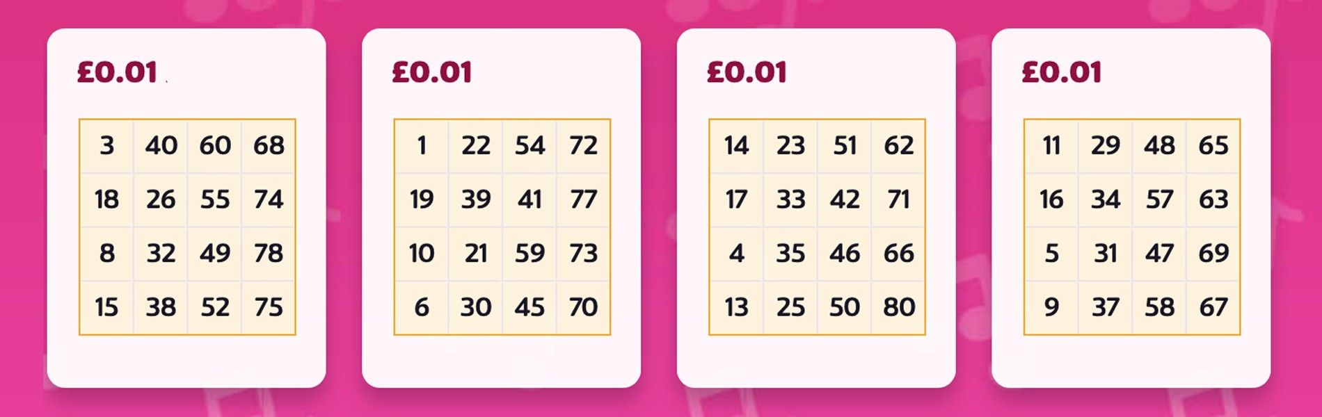 Like 75 ball bingo in our Rodeo Room, our 80 ball games are also pattern bingo which means it’s winner-take-all scenario. You can buy any number of tickets from 1 up to 100 for just 5p each, and you get a 4x4 grid of 16 numbers.