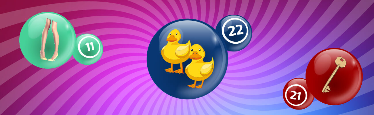 Bingo terms are a real melting pot of cultural references, simple rhymes and other categories. Some of the best known bingo calls are based on the shape of the numbers such as Legs 11, Two Little Ducks (22), Droopy Drawers (44) and Two Little Crutches (77).