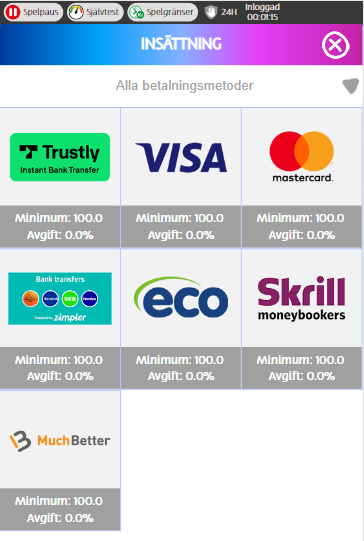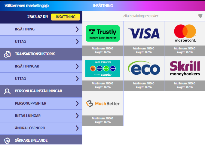 Att göra insättningar på ditt konto är avgiftsfritt och säkert. Kolla in listan på vår sida för betalningsmetoder, så ser du alla de kort, e-plånböcker och andra metoder vi erbjuder och rekommenderar.