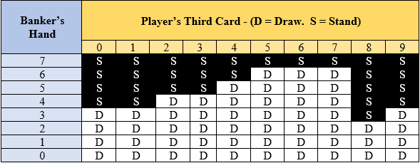 For the Banker, there are more third card drawing rules due to the Player having the opportunity to draw a third card first. See table below: