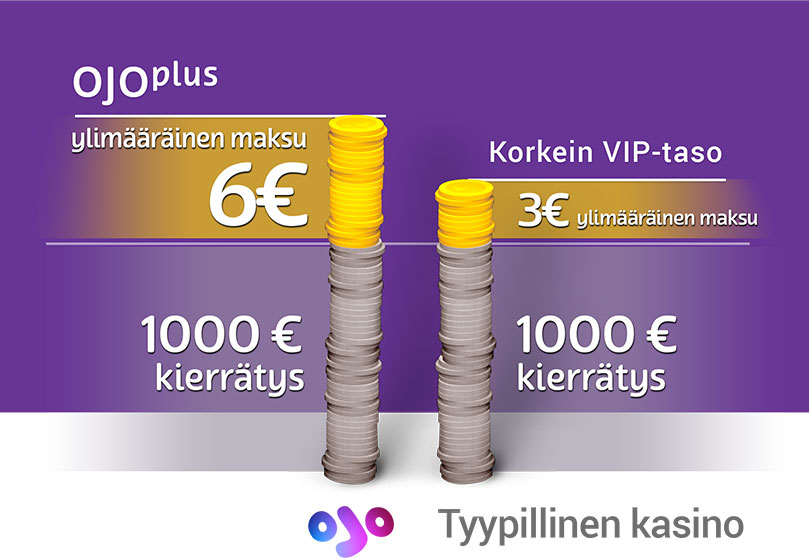 *Huomioithan, että vertaamme OJOplus-rahaa ainoastaan käteiseen, joka voidaan lunastaa muilla kasinoilla keräämällä VIP-pisteitä, joita myönnetään kierrätyksen perusteella.