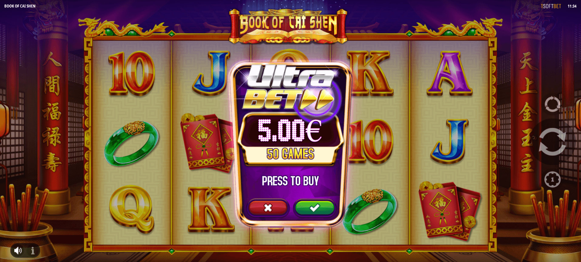 Vid sidan om spelet ser du i Book of Cai Shen casinospel alltid en Ultra Bet-knapp. Klicka på denna för att aktivera den. Och vad innebär det då att ha Ultra Bet aktivt? Svaret är att funktionen låter dig spela 50 rundor med en insats på 50x.