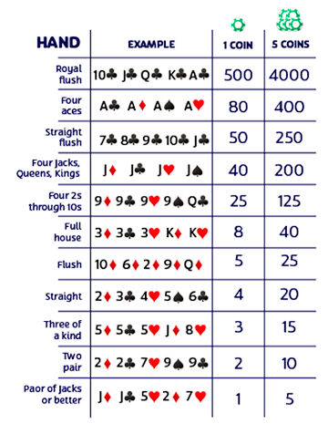 The best hand in any possible poker game is the Royal Flush. For Aces and Faces, the payout is 800:1 if you’re playing with all 5 credits (max bet). If not, you still get a 500:1 payout if you get the hand.